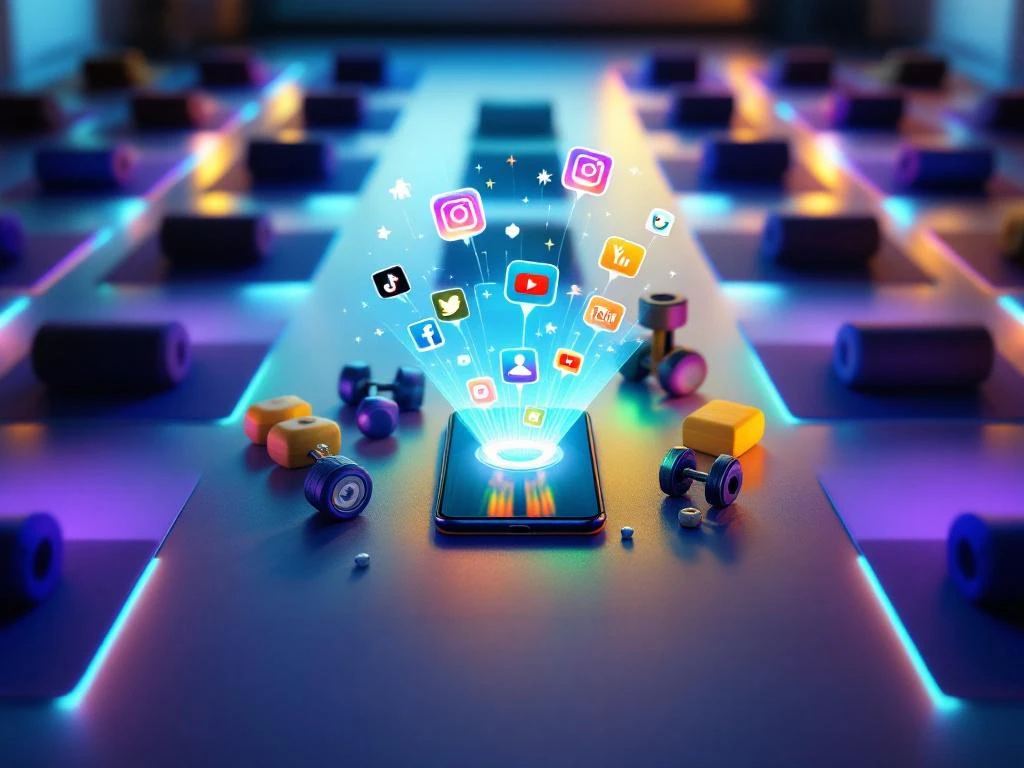 Smartphone met sociale media iconen boven yogamatten in moderne fitnessstudio met LED-verlichting en fitnessapparatuur